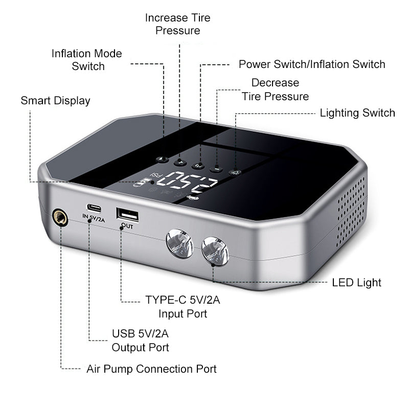 Fonctions du produit : Démarrage / Gonflage / Recharge / Éclairage
