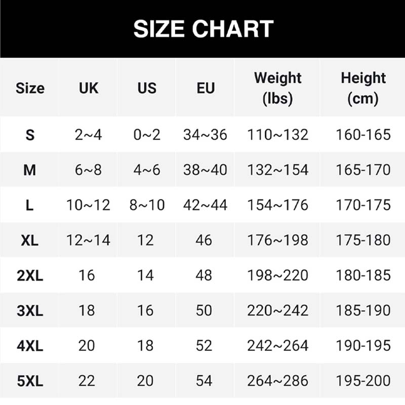 Tailles : S, M, L, XL, 2XL, 3XL, 4XL, 5XL